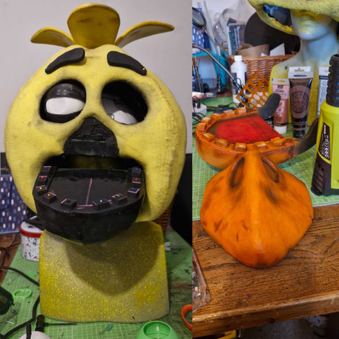 Chica was a wearable suit that was fabricated from scratch using a mix of EVA and upholstery foam. Chica's body and head patterns were made from scratch using reference images from the game and film.